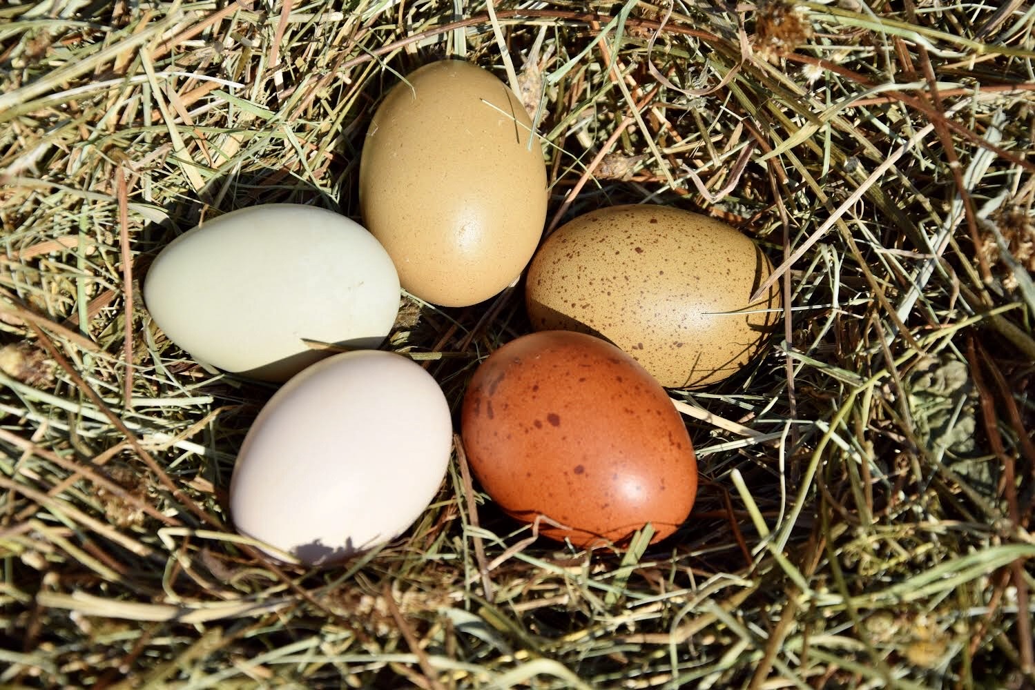 Unsere freilaufenden Hühner legen fleißig viele bunte Demeter zertifizierte Eier.